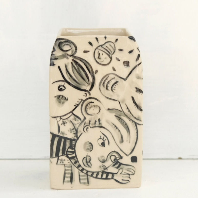 Low Vase with handles illustrated ceramic vase hand made